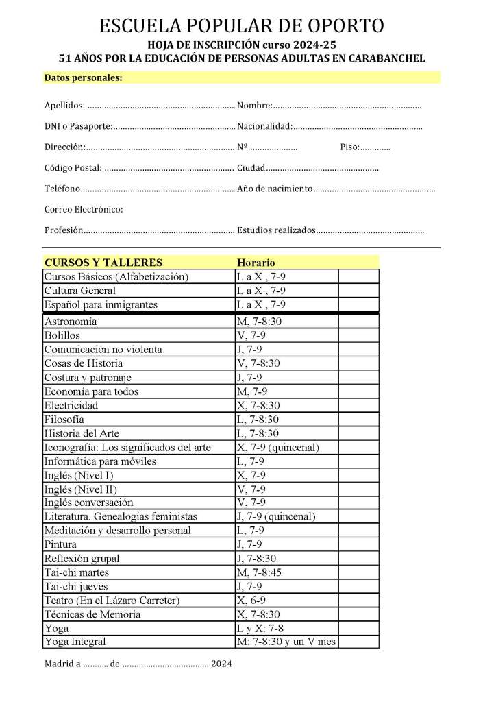 Hoja de inscripciones para el curso 2025 – 2026